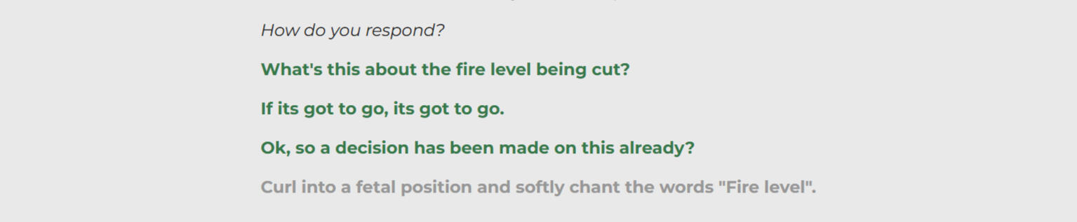 Working with a Designer: Fire Fiasco is a short interactive fiction game that simulates a series of complications that could arise in a game studio. You play as the sole Game Writer on the team, navigating some of the challenges that real game developers face. The game features five different endings, directly based on decisions the player makes while playing the game.Susan O'Connor, CEO & Founder of The Narrative Department, contracted me to collaborate with writer Philip Balli to create this short educational game for her Game Writing Masterclass. This Twine serves as a tie-in for a learning module on how to effectively collaborate with designers as a game writer. I handled all of the game logic and narrative structure while my collaborator provided the writing.